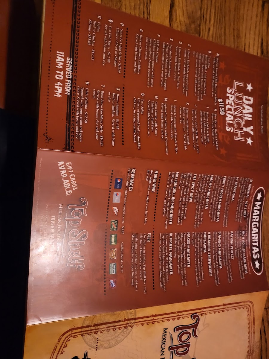 At Top Shelf Mexican Food & Cantina Menu, you'll find a vibrant collection of bold flavors and hearty dishes inspired by the heart of Mexican cuisine. Whether you're craving sizzling fajitas, tender carne asada, or freshly made guacamole, there's something for everyone to enjoy. The menu is a feast for the senses, offering a variety of options from spicy tacos to indulgent enchiladas, all made with the finest ingredients. Pair your meal with a refreshing margarita or a cold cerveza from the bar, and you're all set for an unforgettable dining experience. With every bite, you’ll taste the passion and authenticity that goes into each dish. Whether you're here for a casual meal with friends or a lively family gathering, the Top Shelf Mexican Food & Cantina Menu has you covered.